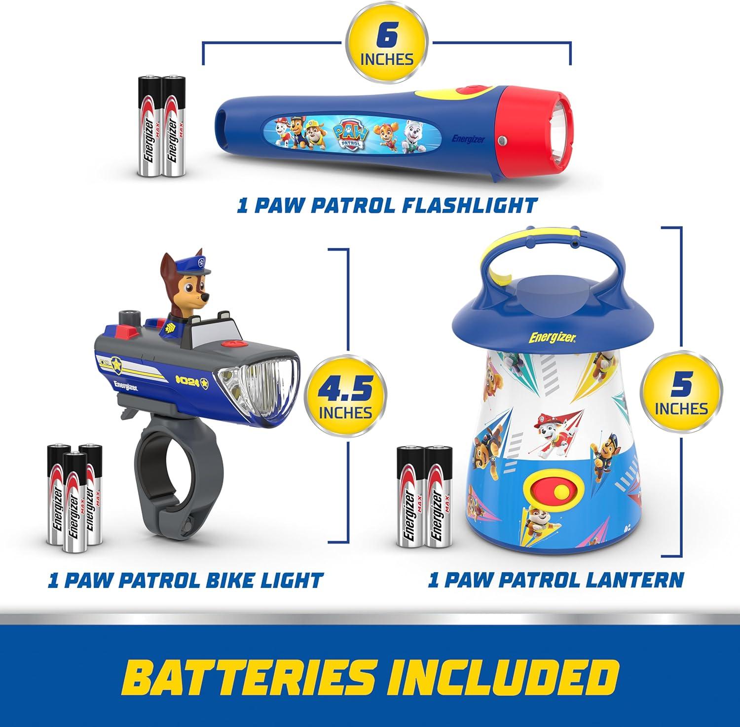 PAW PATROL LIGHTS COMBO PACK: The Energizer Paw Patrol Flashlight, Lantern, and Bike Light Combo Pack for Kids includes three different LED lights, each featuring bright colors and beloved characters from the hit TV series