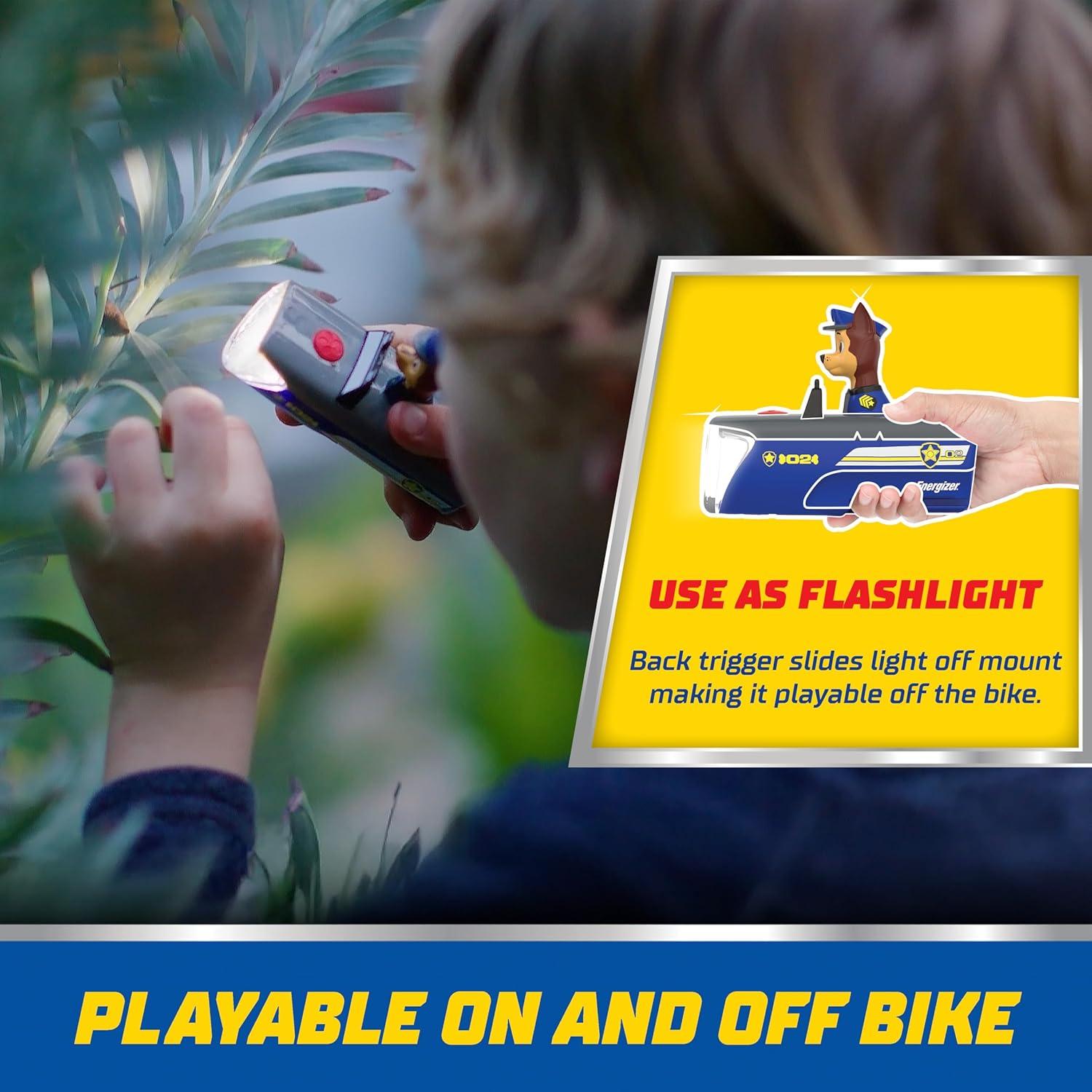 BIKE LIGHT: The Paw Patrol kids bike light is a front bicycle light powered by three AAA batteries; shaped like Chase in his police cruiser, this bike flashlight features both a regular white mode and a red and blue flashing mode