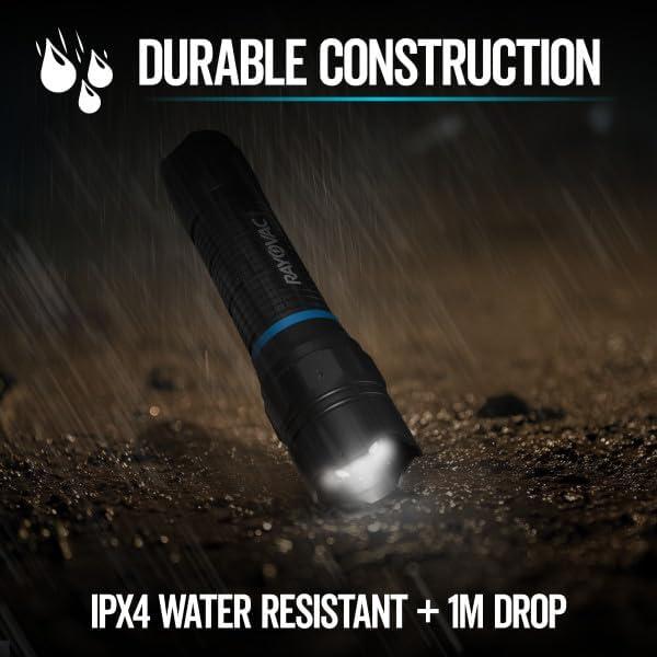 DURABLE ALUMINUM BODY: A rugged metal flashlight with an industrial-grade aluminum body; rated IPX4 water-resistant and can withstand drops up to 1m