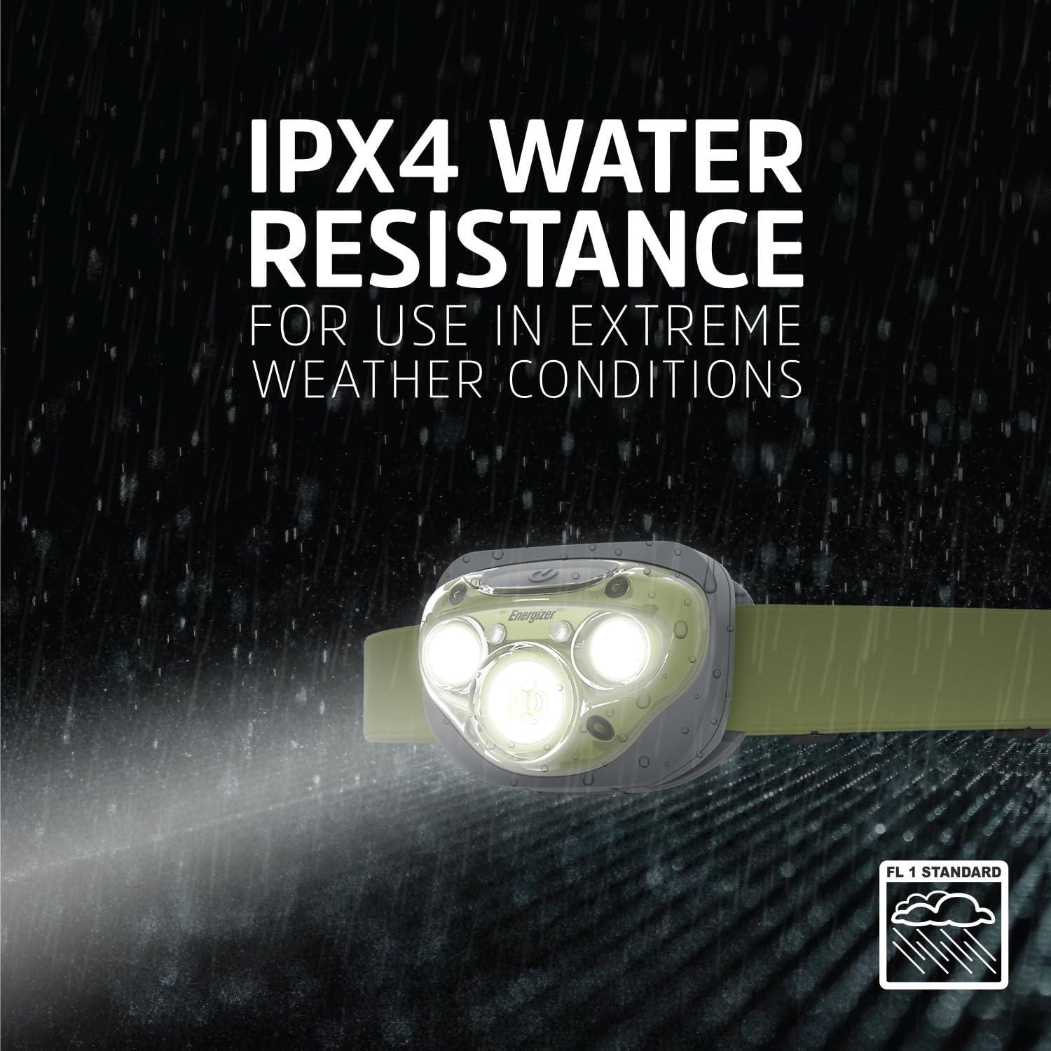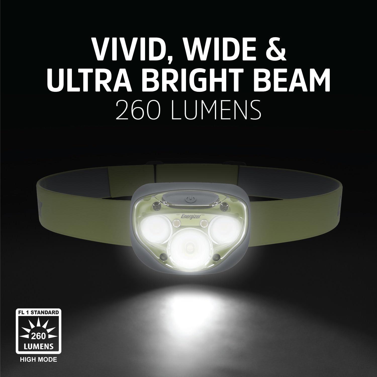 [SUPERIOR LED LIGHT]: Energizer headlamp emits 260 lumens and is 4x brighter light than standard LED technology with dimmable switching from 10% to 100% intensity on all modes, including high, spot and wide modes