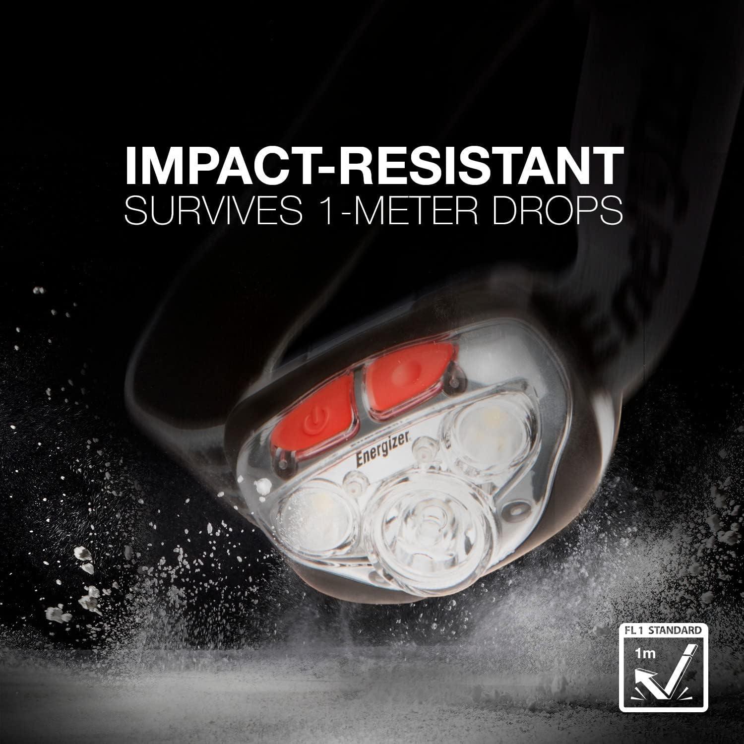 Energizer headlamp with water resistant construction, impact resistance up to 1 meter, and pivoting light for durability.