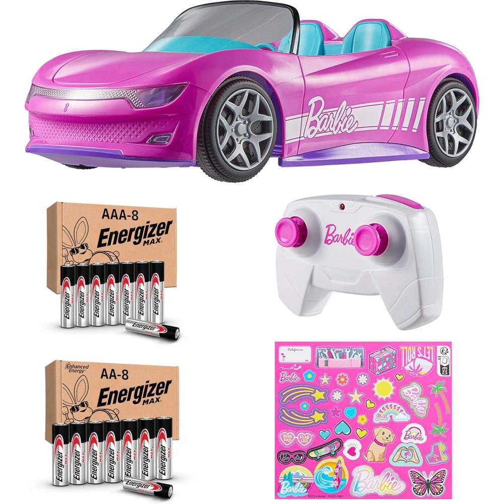 Hop into the Hot Wheels RC Barbie Convertible for an epic road trip! This super cute and signature pink remote-control car fits two Barbie dolls and has room in the trunk for storing important road-tripping accessories. It also includes a sheet of stickers to add personal style to the car's look! Choose from two driving modes – story and speeder – to adjust to different terrains and vibes. Dolls and accessories sold separately. Colors and decorations may vary. Comes with an 8 pack of Energizer MAX AA Alkaline batteries and 8 pack of Energizer MAX AAA Alkaline batteries.
